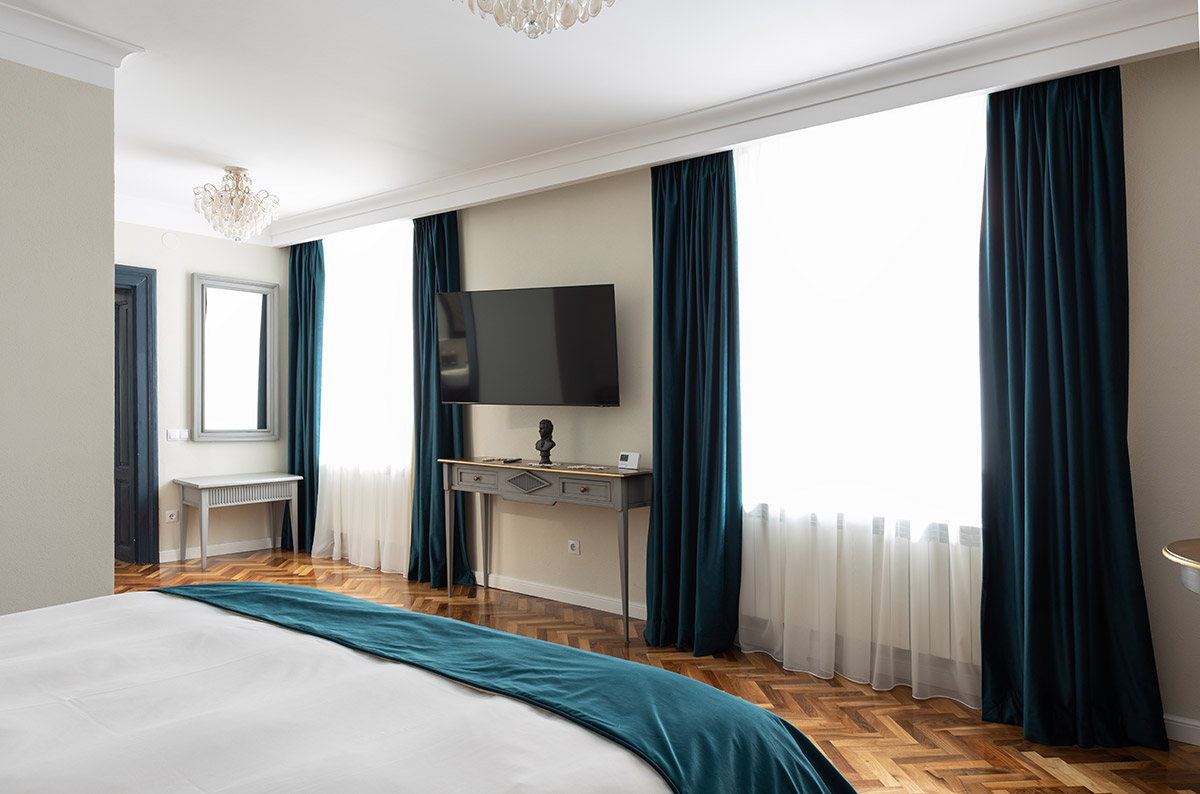 The room has air conditioning, Wi-Fi, 2 smart TVs, a bathroom with a walk-in shower, Rituals cosmetics, hair dryer, coffee maker, water kettle, coffee, tea, water, minibar, coat hanger and a wardrobe, while the antique Baroque style doors imbue the room with the cosiness and comfort of a small holiday home.